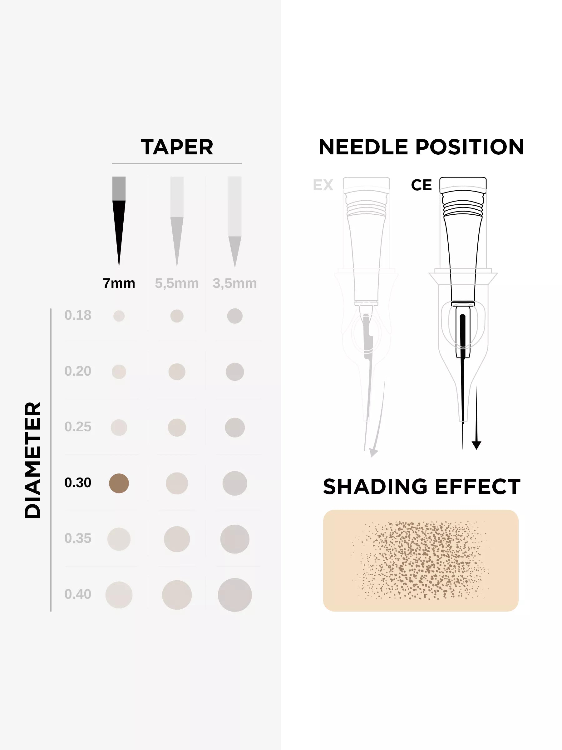 7mm Taper (Long): Provides flexibility and smoother pigment flow for better control and precision. Long tapers cause the least amount of trauma to the client’s skin and hold less pigment, allowing for slow and controlled color building. They also create the smallest pixelation when shading, ideal for smooth, natural transitions.