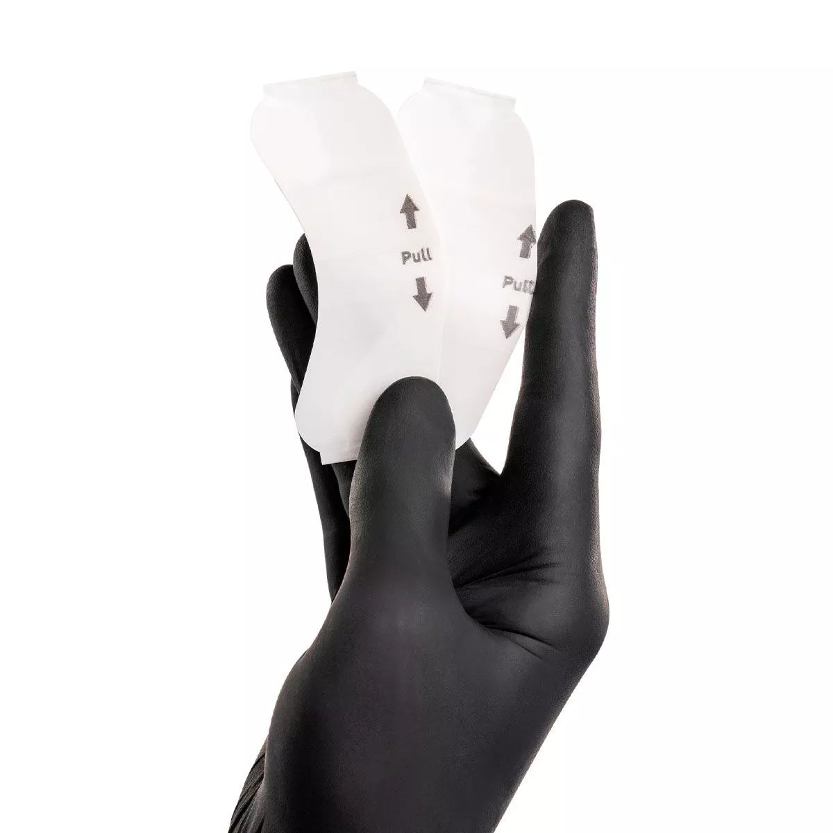 Open the paper sachet and take out the patches. Remove the protective foil by pulling it outwards from the centre. Apply the patches to the eyebrow. Remove the remaining inner foil by pulling it in the direction of the arrow.